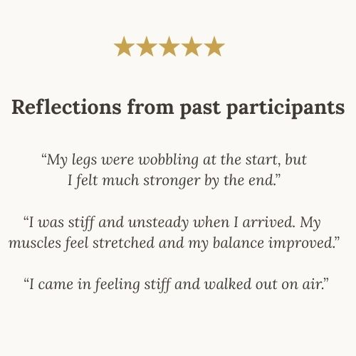 If you already feel very steady, can comfortably stand on one foot for a full minute and regularly enjoy advanced balance challenges, this workshop may not be what you’re looking for right now.
